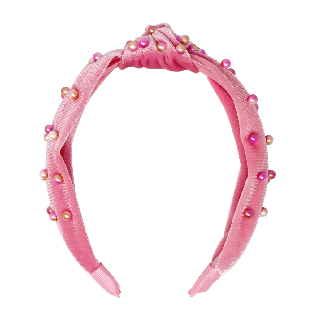 Featuring pearl beads embellishments on a soft pink velvet fabric, knot detailing on a wide band, slip on style.