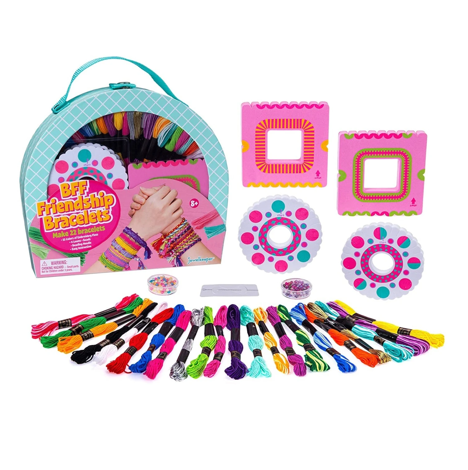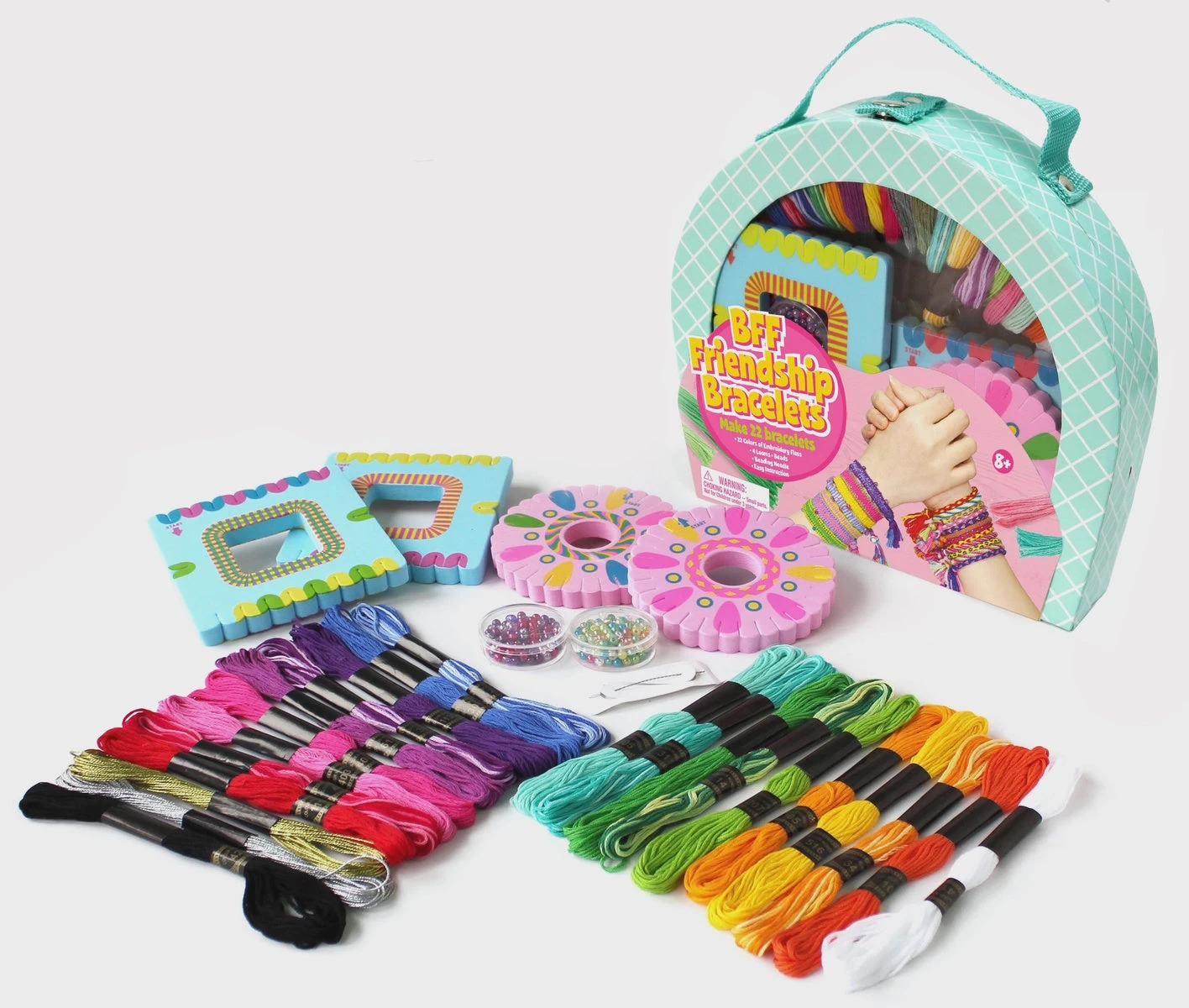 Weave your own colourful bracelets with this DIY kit. With the help of the wheel and square card you will be able to thread beautiful colour strings together to make tightly woven bracelets to give to your special friends. Each bracelet has its own colour and patterns.