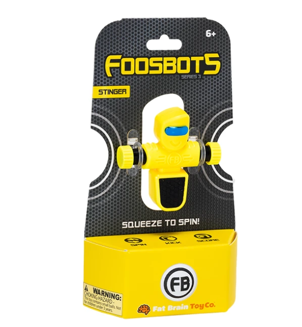 Single Foosbots to collectEncourages hand-eye coordination, fast reflexes, creativitySqueeze the arms to make it spin and kick the ballEach features unique colors and design featuresIncludes one Foosbot, one ballFoosbots each measure about 2.75 x 2.5 x 0.75 inchesHigh-quality materials and construction – Exceptional gameplay
