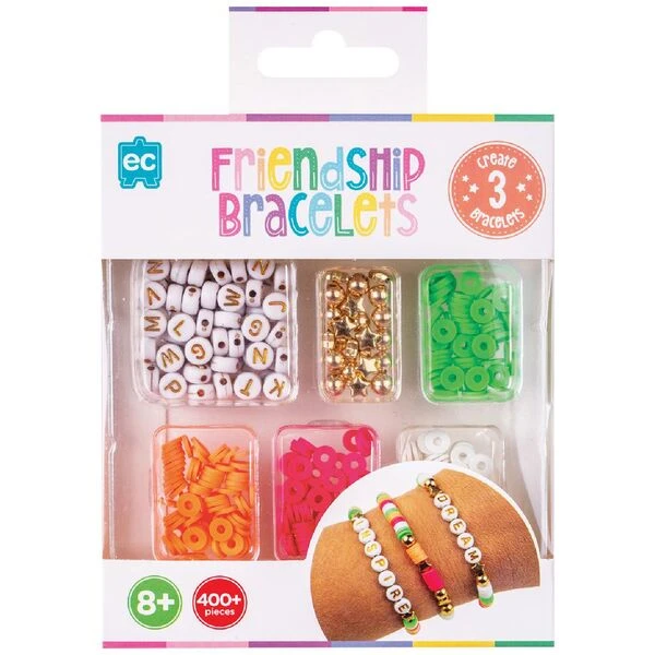 This Educational Colours Friendship Bracelet Set comes with enough colourful beads to make 3 eye-catching friendship bracelets. The set contains colourful heishi clay beads, gold beads and alphabet beads that you can thread together to represent a special name, song, word, phrase, or anything else meaningful to you. The transparent elastic band allows the bracelet to stretch over your hand and fit snug around your wrist.