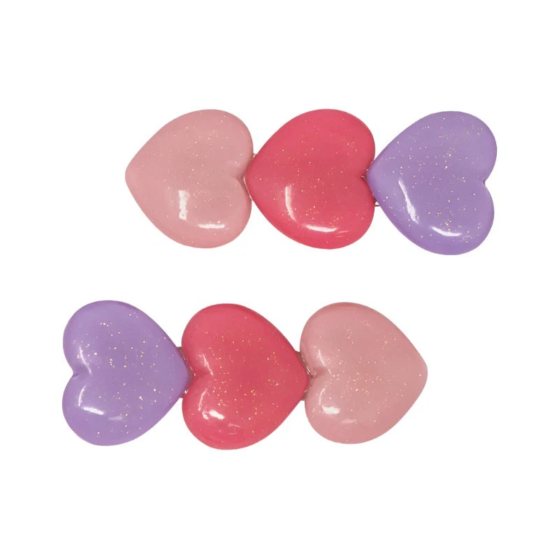 Pink Poppy’s Glitter Hearts Alligator Clip Set includes a set of two 2 large barrette style hair clips in gold metal and adorned with 3D bubbly acrylic hearts. Finished with a sparkle resin look the pretty pastel hues add a sweet heart look to any hairstyle.