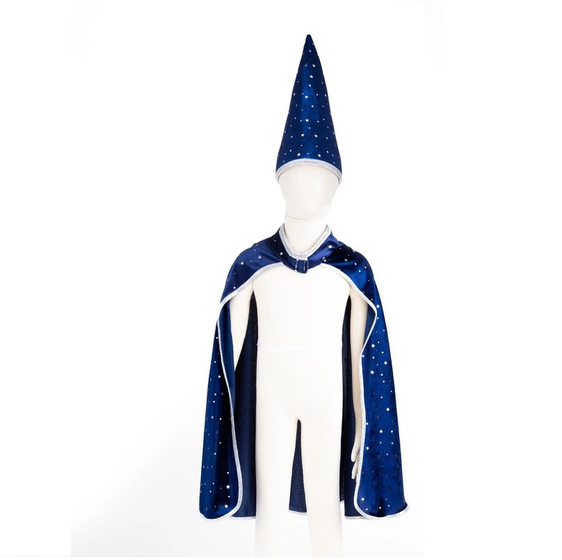 The ultimate magician wizard set for pretend play. This 2 piece set includes a pointed wizard hat with an elastic chin strap & cape for a complete magical look. The cape design features silver glitter printed stars and moons on a deep midnight blue velour.