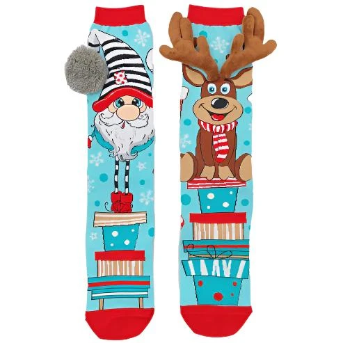Where is Santa? Where is Santa’s Reindeer? Here I am, here I am! Merry Christmas to you all, Ho Ho Ho!! Enjoy your holiday season with our wonderfully festive Christmas Socks, one Sock with Elf & custom-made pom pom and the second one with Santa’s Reindeer with custom made antlers.