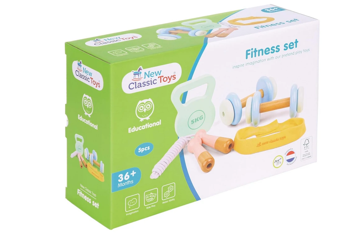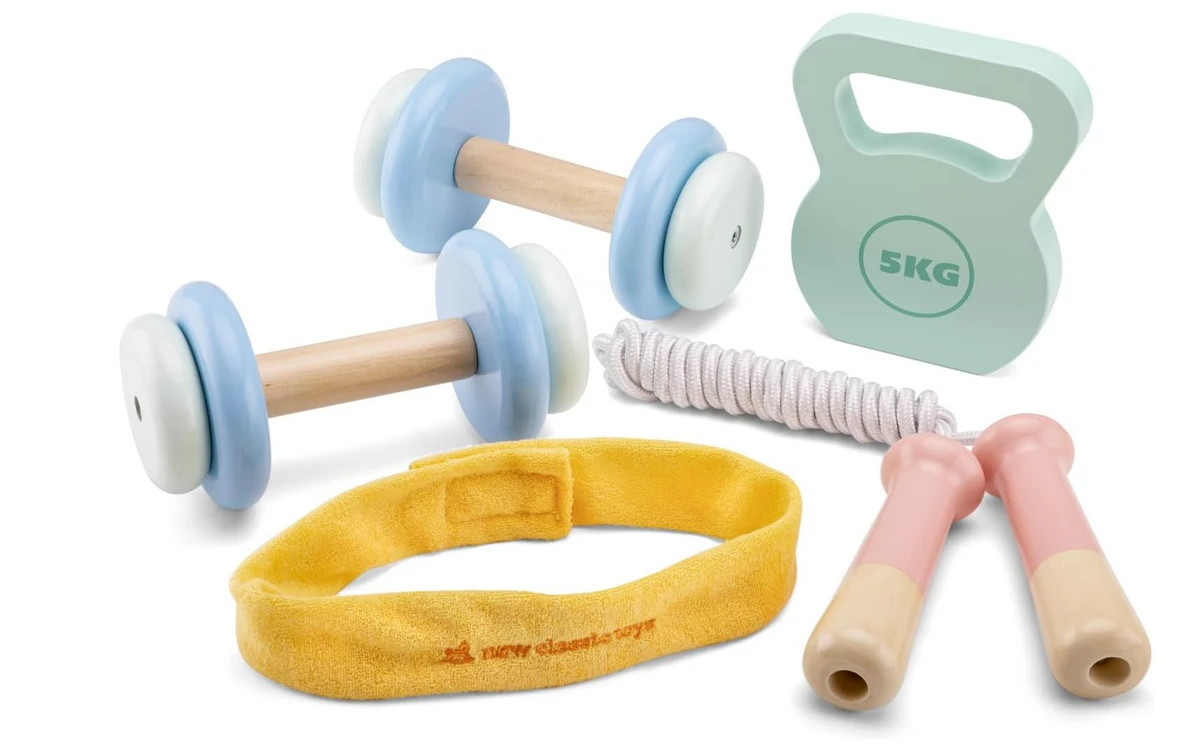 Get little ones active and moving with this wooden pretend play fitness set from New Classic Toys. This set includes everything children need for a fun imaginative workout session, including two wooden dumbbells, a wooden kettlebell, a jumping rope, and a headband. Designed to provide children with an interactive way to engage in physical activity, this set promotes gross motor skills and an active lifestyle through imaginative play. The dumbbells can be used for pretend play weightlifting while the headband will help them stay cool during their play sessions. It’s a fun way for children to mimic their parents workout routines and develop healthy habits.