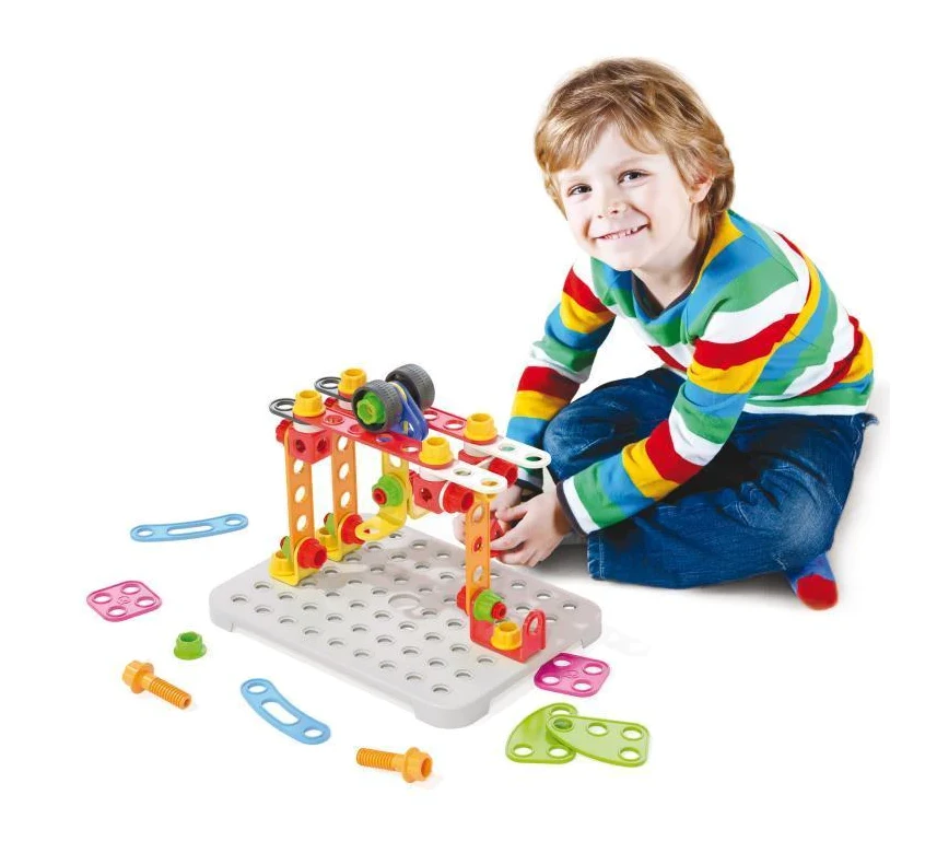 Techno Jumbo Toolbox has everything a child needs to build a world of trucks, excavators, cranes or anything else that comes to mind. Screws, bolts, wingnuts, wheels and perforated plates, made of resistant shatterproof plastic, can be assembled without special tools. All a child needs is a pair of hands and a lot of imagination. When playtime is over, everything fits back into the handy tool box. The box has a handle and a cover that can be used as a base for playing on. This building toy stimulates coordination as well as logic and creativity, helping children to understand basic principles of mechanics while enjoying themselves.