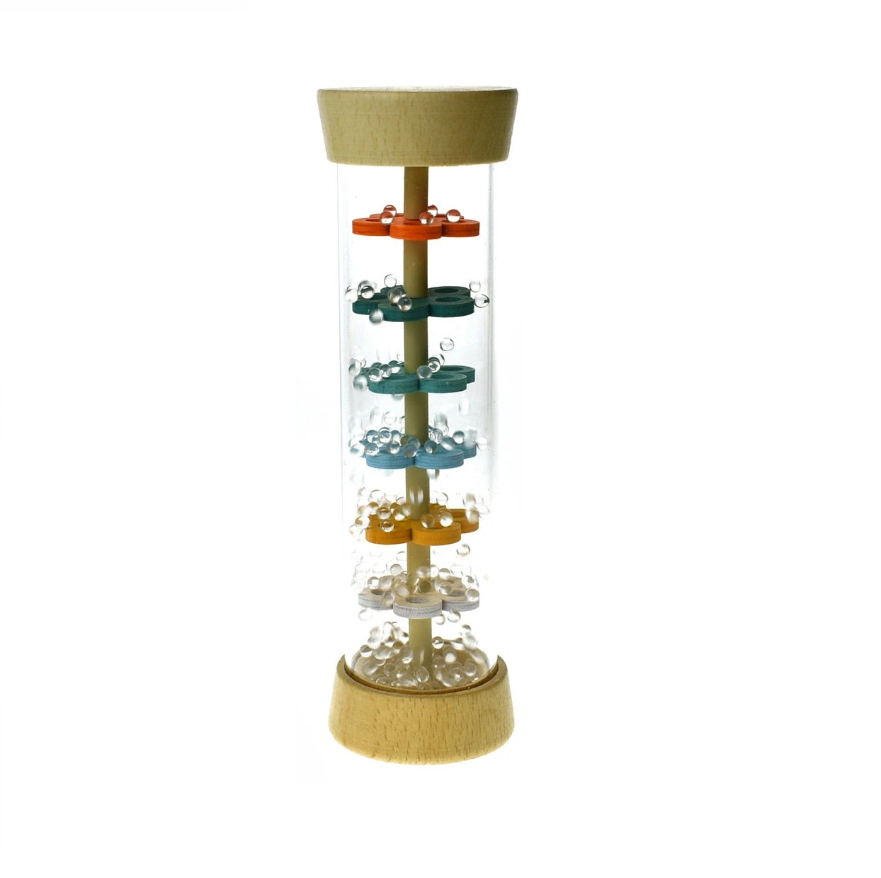 This wooden rain stick recreates the soft sound of falling rain. The tube is transparent so kids will be able to watch as the clear beads cascade through the tube, creating fascinating sounds and visual effects. Bright and durable.