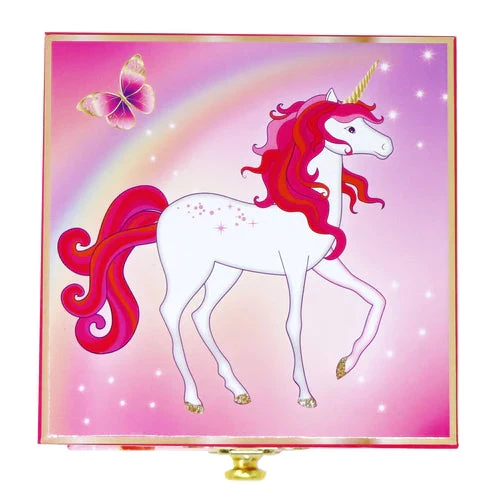 Pink Poppy’s Unicorn Butterfly Small Musical Jewellery Box is a gorgeous keepsake portraying fun illustrations of a fantasy land full of rainbows, butterflies, and flowers. It features an oval mirror and a flocked interior. The wind-up design plays the classic tune ‘Dance of The Sugar Plum Fairy’ whilst the Unicorn figurine twirls delightfully.